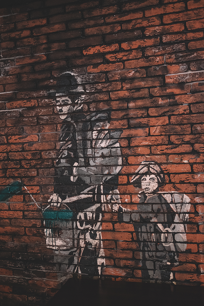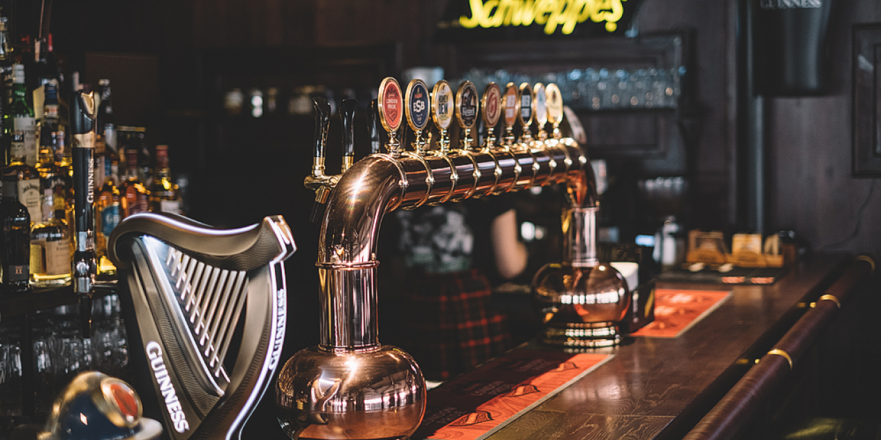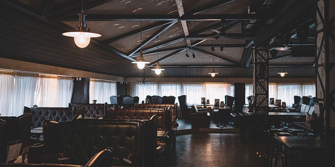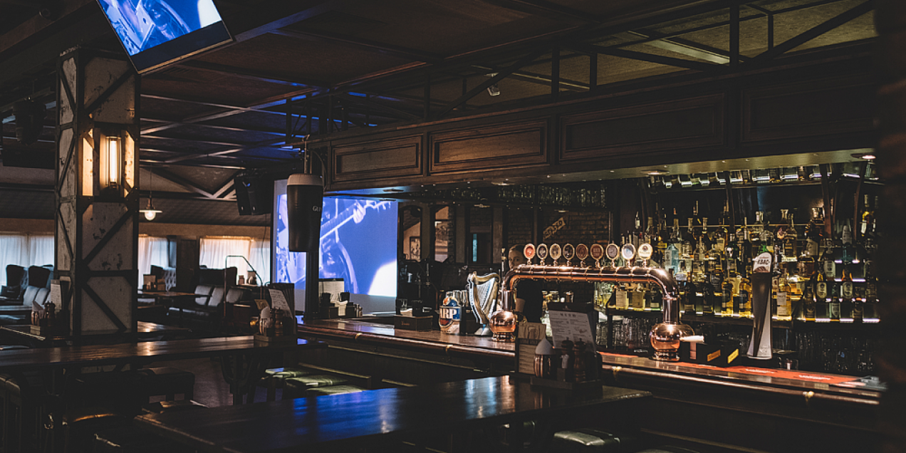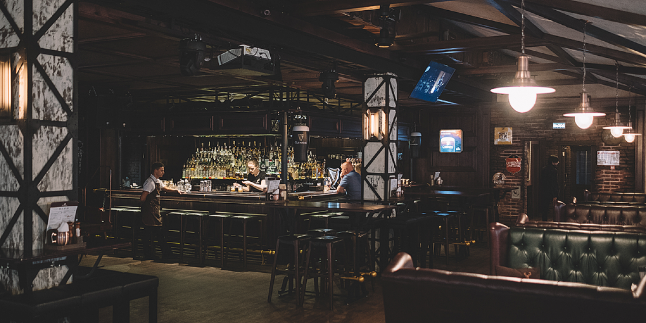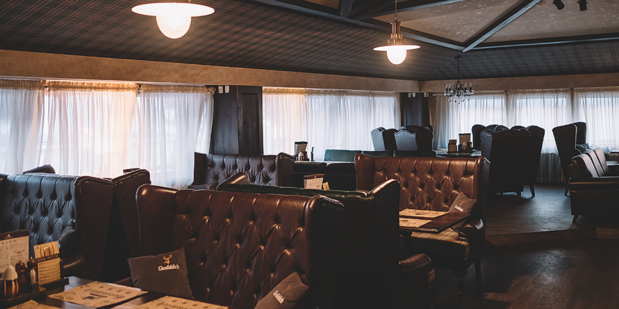The interior is made in brown and green tones. A Scottish cage on the ceiling, graffiti on the walls, leather sofas and an old car scene. It is here that you can comfortably stay with your friends. The institution has about 100 seats, as well as a large bar area for 25 people.